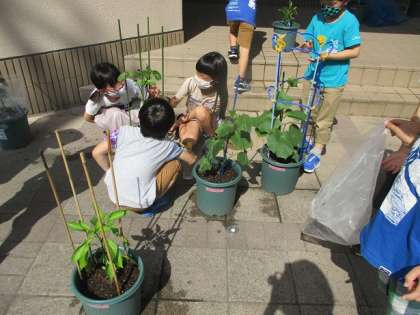 友達の野菜の様子を見ながら、どんなお世話をしているか聞いたり、自分の野菜の様子と比べたりしていました。実が大きくなってきて、収穫を楽しみにしている様子も見られます。