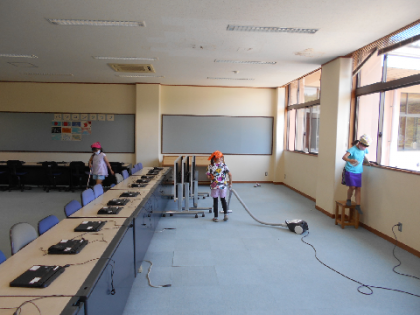 黙々と掃除をする4年生です。教室はもちろん、コンピュータ室や音楽室等、他の学年が使う教室も、丁寧に掃除していますね。