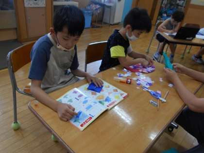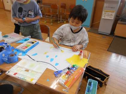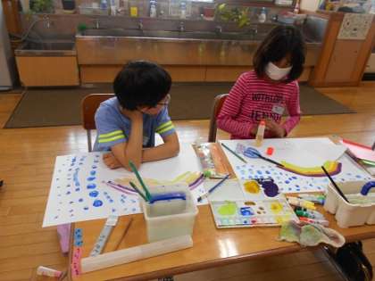 今日のチャレンジタイムは、みんなで6月をイメージした飾りを作りました。雨粒、あじさい、かえる…みんなの個性があふれた素敵な作品がたくさん仕上がりました。