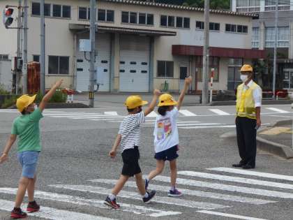 ビデオで、正しい横断歩道の渡り方を学びました。実際の道路で「止まる、左右を見る、気を付けて歩く」を守りながら横断歩道を渡りました。