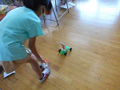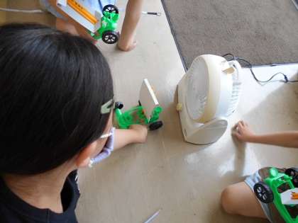 理科では、「風やゴムで動かそう」の学習をしています。 風が弱いのと強いのでは、車の動きはどうなるのかを実験しました。