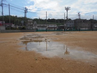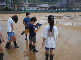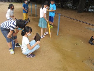 理科の学習で「雨水のゆくえ」を学習しています。今日はグラウンドにできた水たまりを観察しに行きました。この水は一体どこへ行くのでしょうね。