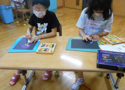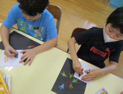 いろいろな形の型を使って、クレヨンや色鉛筆で、思い思いの花火を描きました。