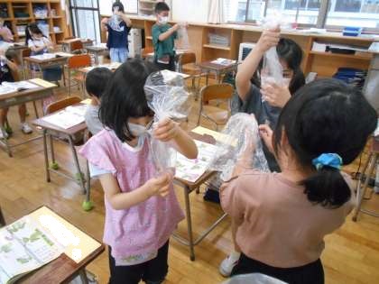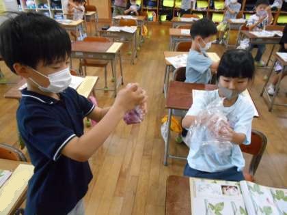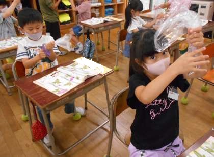 「どんな色になるのかな」と楽しみながら色水づくりをしました。きれいな水色や紫色ができましたよ!