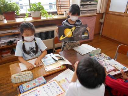 国語の学習では、図鑑や科学の本などを図書室で借り、はじめて知ったことを友達に発表しました。