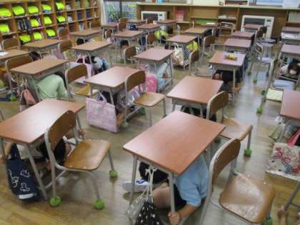 1年生 シェイクアウト訓練 公開日 2021/09/02 更新日 2021/09/02 1年生 「まず低く」「頭を守り」「動かない」 この3つを守って、地震が起きたときの身の守り方を練習できました。 緊張感をもって取り組むことができました。