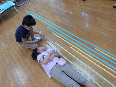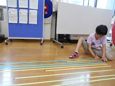 すみれでは、学校にある色々なものを紙テープではかり、長さ比べをしています。長く、背が高いと思っていたものが意外に小さかったり、短く、小さいと思っていたものが大きかったりと、発見も多かったようです。