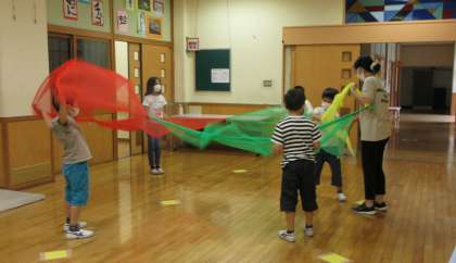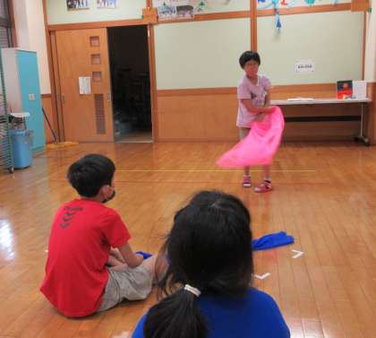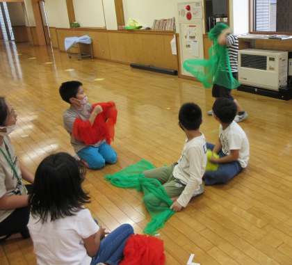 好きな色のスカーフを選んで、ふわふわの風、ぐるぐるの風、風速200メートル?の風と自由に動きながら表現しました。友達の前で発表したり、みんなでスカーフをつなげたりと風を楽しみました。
