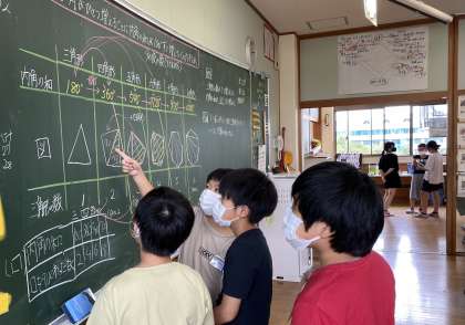 黒板の前に集まって話をする子供たち。 授業で話し合った内容について、友達同士で確かめ合っているようです。