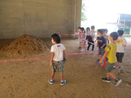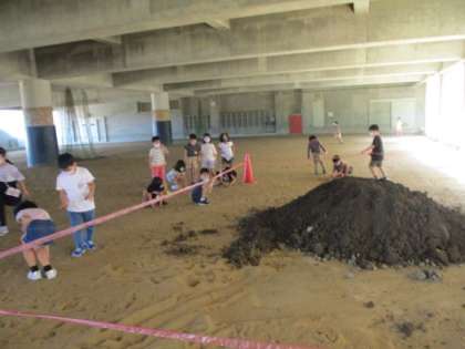 土の山とご対面し、「早く遊びたい」とやる気満々の子供たち。