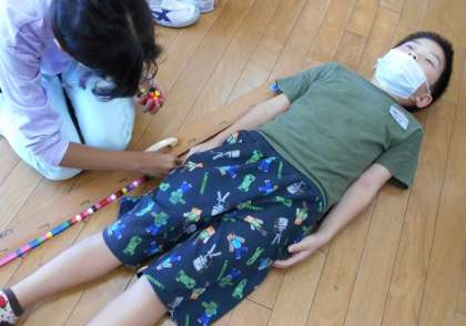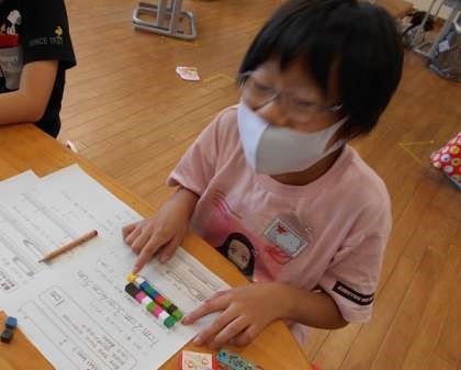 すみれ級では、算数で長さの学習をしています。1cmの立方体を使って、いくつ分になるかを数えています。みんなの身長はいくつ分だったかな?