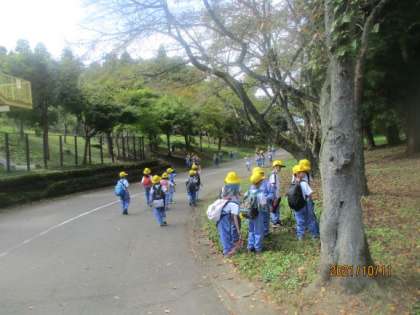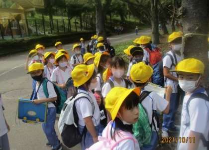 芝生の広場を出て、園内を探検しながらクイズやお題に挑戦しています。
