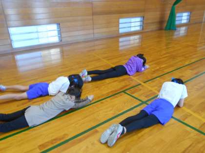 4年生は、体育の学習で、テーマに合わせた身体表現をクラスごとに考えています。