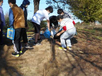 流れる水のはたらきを調べるために、自分たちで川を作り、どのように運搬・浸食・堆積するのか実験しました。予想外の結果に、驚く様子が見られました。
