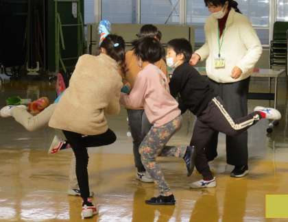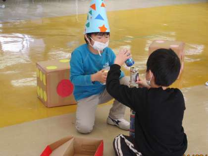 すみれ級では、みんながすごろくのコマになってからだすごろくをしています。みんなが考えたチャレンジゲームのマスで止まった時は、協力してゲームにチャレンジ!みんなのにこにこ笑顔がステキ!