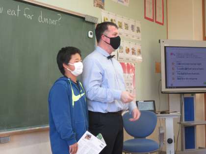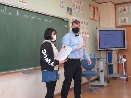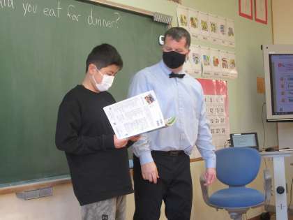 外国語の学習では、よく食べている物やその食材の産地などについてスピーチを行いました。外国語をスラスラと話せるようになってきました。かっこいいですね。