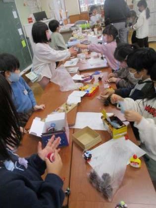自分たちで準備した「お店屋さん」になって、工作や遊びの仕方を教えたり、つくった品物を見せたりしていました。
