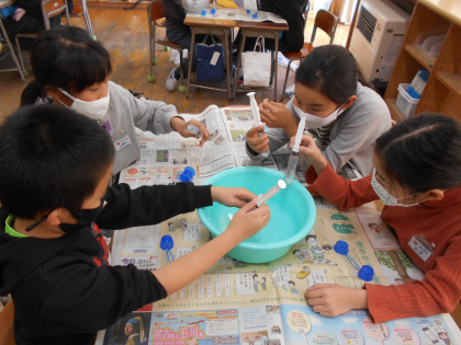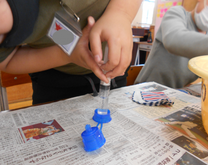 理科の学習で、注射器の中に水を閉じ込めて押しました。空気を閉じ込めたときと違って、水を閉じ込めたときは注射器を押せないことに、子供たちは驚いていました。