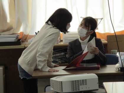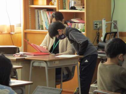 4年生の子供たちは、それぞれの担任と2学期の学びを確かめながら、通知表「あゆみ」を受け取りました。