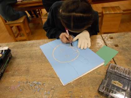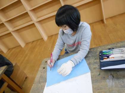 初めて版画に挑戦します。彫刻刀を使うことに、最初はとまどいもありましたが、慣れてくると器用に掘り進める姿が見られました。自分の思いを大切にして、線の太さ等を工夫しています。