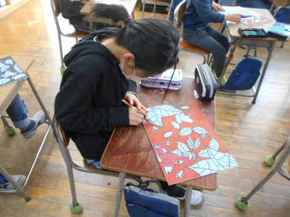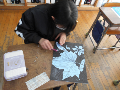 図画工作科で版画の学習をしています。作品のテーマは「葉」。三角刀や丸刀の特徴を生かして、細かいところまで丁寧にほっていました。
