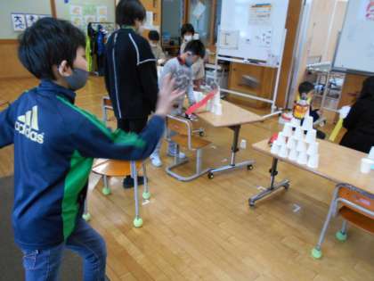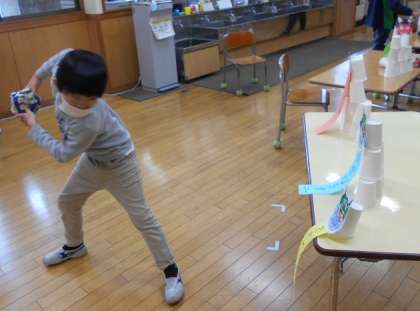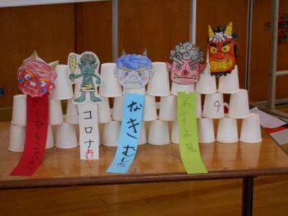 自分のオニのタワーを作り、新聞紙ボールを投げてオニ退治をしました。「オニ、いなくなれ!」「もう泣かないよ」と、オニ退治を終えた後は、清々しい笑顔があふれました。