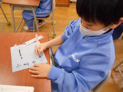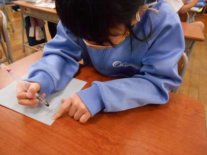 書写の学習では、水筆を使って「とめ」「はね」「はらい」の練習をしました。線の終わりに気を付けて書くことができました。