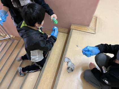 前回の家庭科の学習で、校内の汚れ調べをした子供たち。