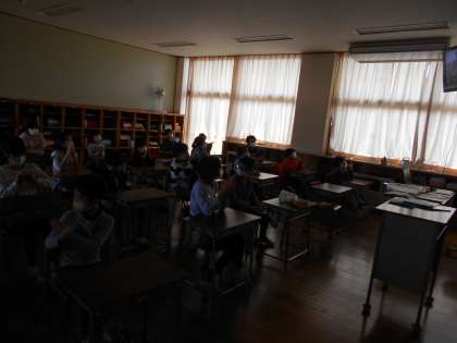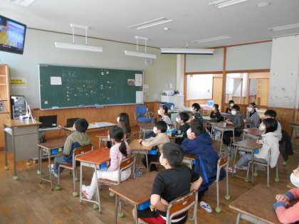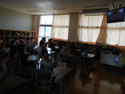 4年生は教室から入学式を視聴しました。拍手の場面では「強く・細かく・元気よく」拍手をし、祝辞の礼にも頭を下げるなど、その場にいるかのように真剣に参加していました。どの学級も大変立派な態度でした。