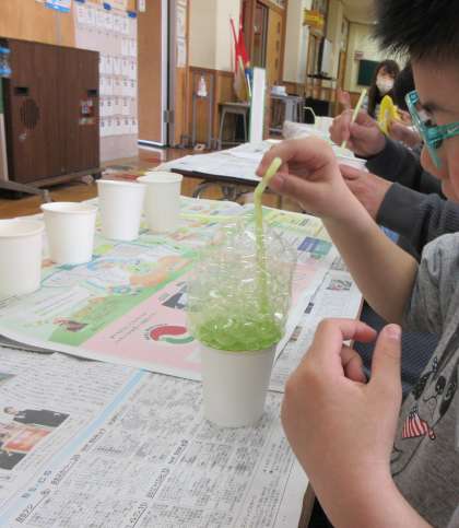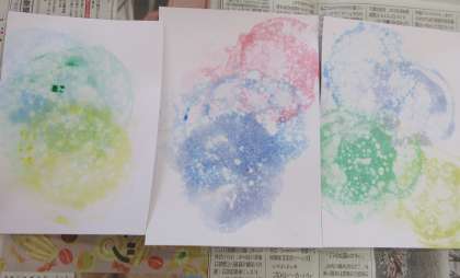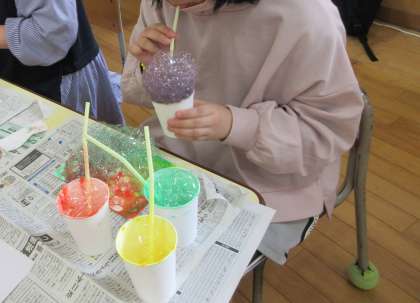 図画工作「バブルペイント」をしました。絵の具と洗剤、水を混ぜてストローで泡を作ります。好きな色、好きな模様をつくって、みんなで楽しみました。