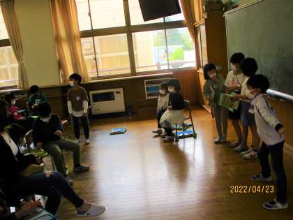 生活科「1年生をおいわいしよう」では、お家の人に相手役になっていただき、1年生との交流集会の練習をしました。