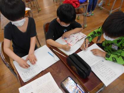 4月26日(火)2年生 自主学習がんばっています! 公開日 2022/04/28 更新日 2022/04/28 2年生 休み時間にも自主学習を進める姿が見られます。友達と一緒に取り組むと、さらに頑張れるようです。