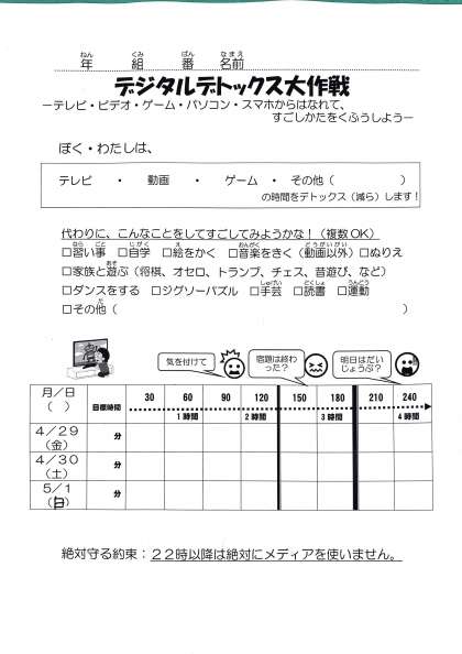 この連休を機会に、ぜひご家庭でもメディア以外の楽しい過ごし方について、お子さんと一緒に考え、実践していただけたらと思います。