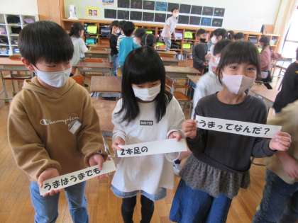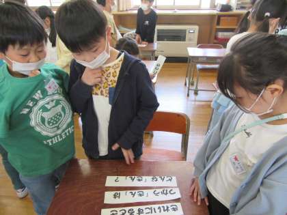 そこで、クラスのいろいろな友達と関わる機会を増やそうと、「シャッフルなぞなぞ」を行いました。文章を完成させるために自分から声をかけたり、協力してなぞなぞを解いたりする中で、楽しく友達と関わることができました。