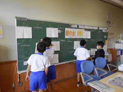 1枚目:朝の様子です。昨日の宿題だった自学を黒板にはり、みんなの分を眺めています。