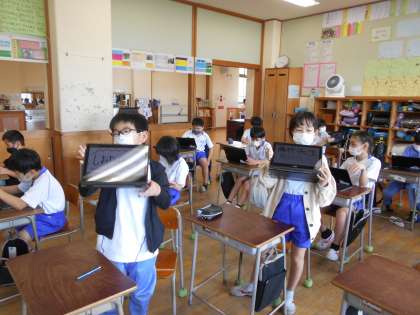2・3枚目:スタートタイムはコミュニケーション活動でした。2組はクイズをしていました。3組はタブレットのスケッチブック機能を使って「〇〇といえば?」のゲームをしました。