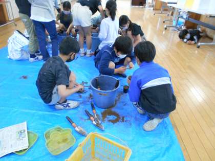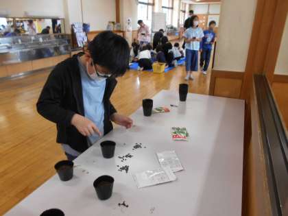 今日の理科は、どの学級もヘチマの種をうえました。ある程度生長したらプランターに移して、外で栽培する予定です。子供たちは「茎はどのくらい高くなるのかな?」「3階まで伸びてくるかな?」と疑問をもったり、生長を楽しみにしたりしていました。