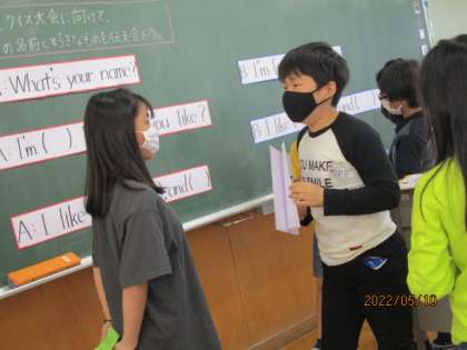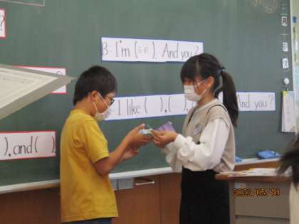 5年生 5月10日(火) 外国語の授業 その1 公開日 2022/05/11 更新日 2022/05/11 5年生 外国語の授業で、子供たちが「わくわく」して活動する姿が素敵でした。チャンツや歌に親しみ、外国語を使って名刺交換をするときも自信をもって自分の名前や好きな物を伝えて相手との会話を楽しみました。