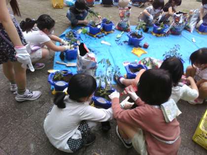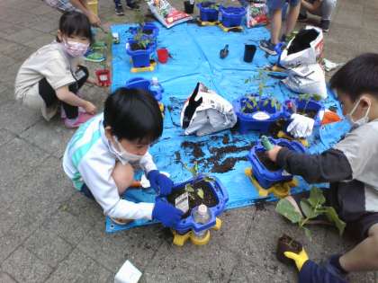 もってきた野菜の苗を鉢に植え替えました。野菜の土以外は、自分たちで用意したものを使います。育て方も自分で調べたり、考えたりして行っていきます。