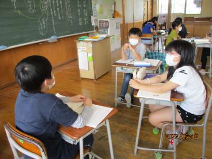 5年生 5月12日(木) 国語科「きいて、きいて、きいてみよう」 公開日 2022/05/13 更新日 2022/05/13 5年生 国語科では、聞く話す力をつけるための学習を進めてます。今日は、グループで「きき手、話し手、記録」を決め、質問したい話題を考えてインタビューしました。あまり知らなかった友達のことを、詳しく知ることができた特別な時間になりました。