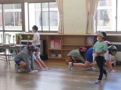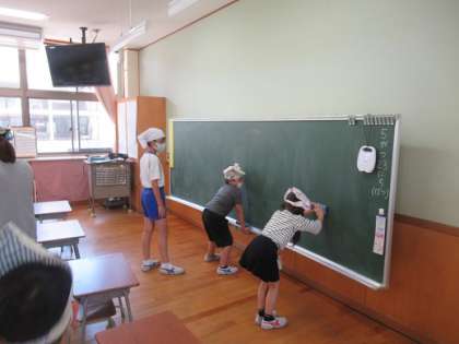 1年生の清掃サポーターとして6年生が活躍しています。本当は声を出して指導したい6年生ですが、それを堪えて「背中で教える」を実践しています。
