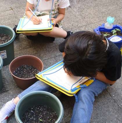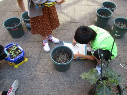 ホウセンカの芽が出ました。葉っぱの細かい模様まで詳しく観察していました。