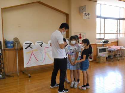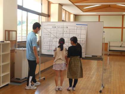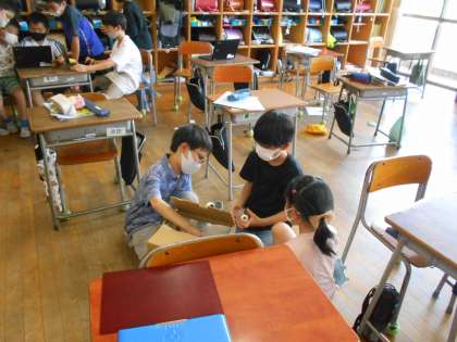 ワークスペースの様子です。担任の先生や水曜日にいらっしゃる先生と触れ合っている児童がいました。教室では、係・会社・サークルの活動をしている子供もいました。