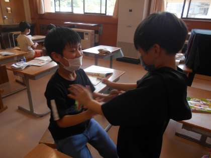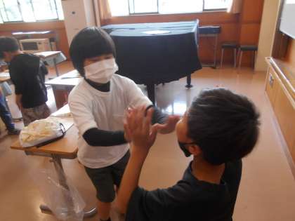 音楽に合わせてリズム遊びをしました。ペアを変えながら、いろいろな友達と楽しく関わることができました。