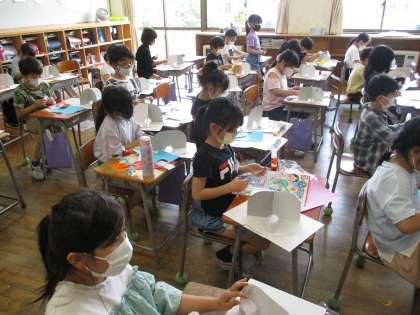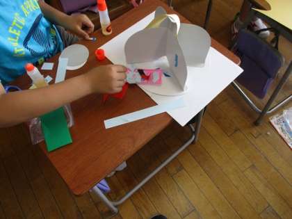 くるくる回る台の仕組みに興味をもち、仕切り台紙をつける位置を工夫したり、仕組みを使ってお話を考えたりしました。