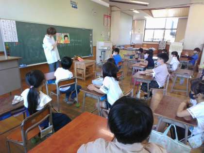 昨年度のお話の会の読み聞かせは、給食時間にテレビ放送されていましたが、今年度は、目の前で読んでくださいました。