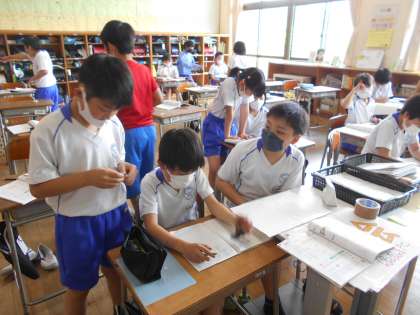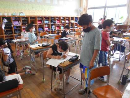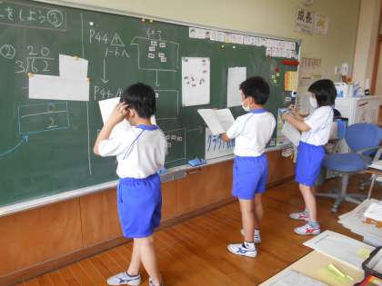 今日はわり算のひっ算の学習3回目でした。「1.立てる 2.かける 3.ひく 4.おろす」の使い方もずいぶんと慣れてきました。みんなに認められたひっ算名人(写真2枚目)は友達に教えています。