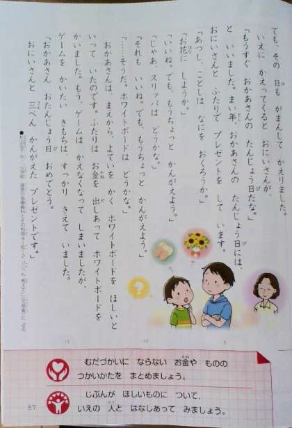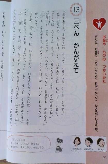 『無駄遣い』の話から『我慢する』、『人のためにお金を使う』と、主人公の気持ちに合わせて、気付きもいろいろあったようです。