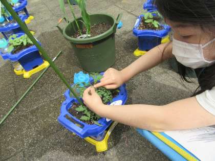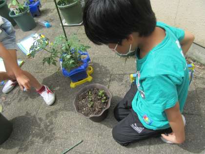 支柱を立てたり、肥料をやったり、日当たりのよい場所に動かしたりと、子供たちは自分でよく考えながらお世話をしています。