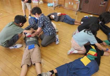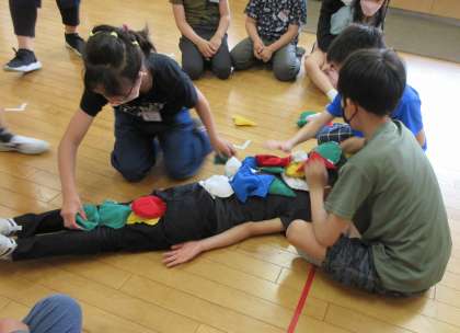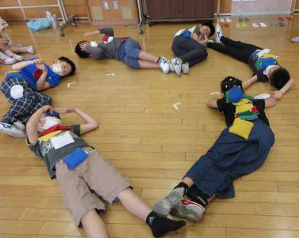 ビーンズバッグ(お手玉)の感触を確かめたり、体に乗せたり、投げたりと自由に活動している中で、背中に乗せている子がいました。そこで、チーム対抗「ビーンズバッグをどれだけ乗せられるか大会」をしました。台になっている子はどんな姿勢がいいか、載せる子たちはどこに載せればいいか、チームで考えながら行った結果、どのチームも成功することができました。まだまだ台になりたい子がたくさんいたので、6年生が中心になって一つの物をつくり上げました。何の形か分かりますか?